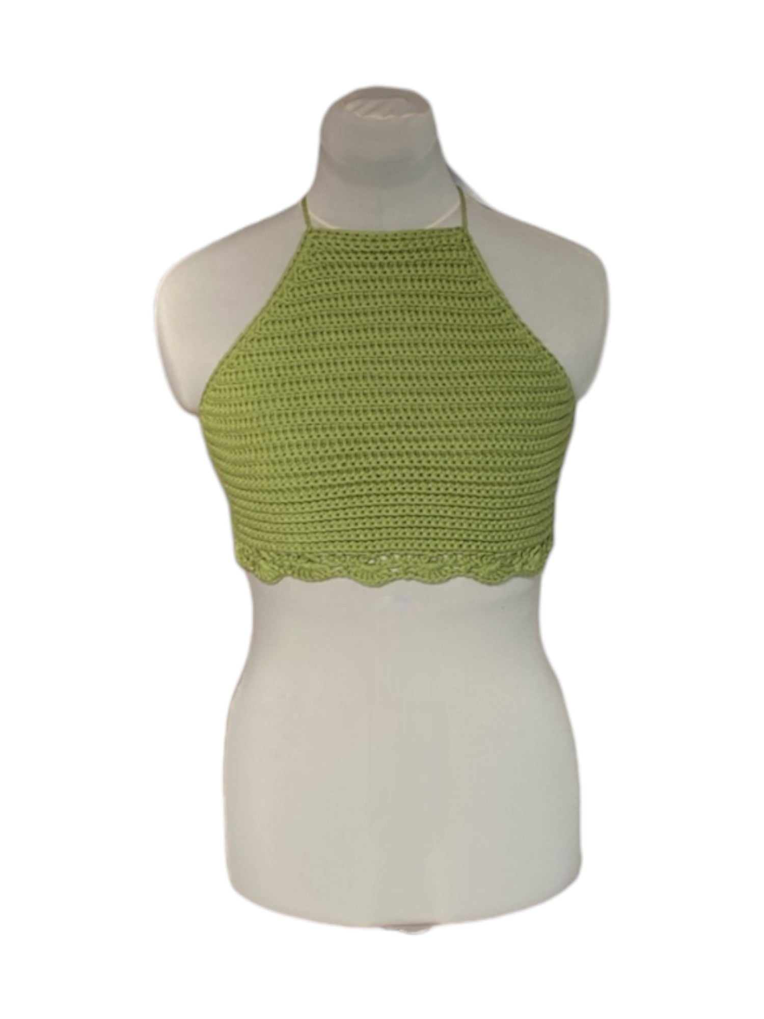 Gehaakte groene halter-top - handgemaakte crop-top met geribbelde structuur en schelpenrand - maat S