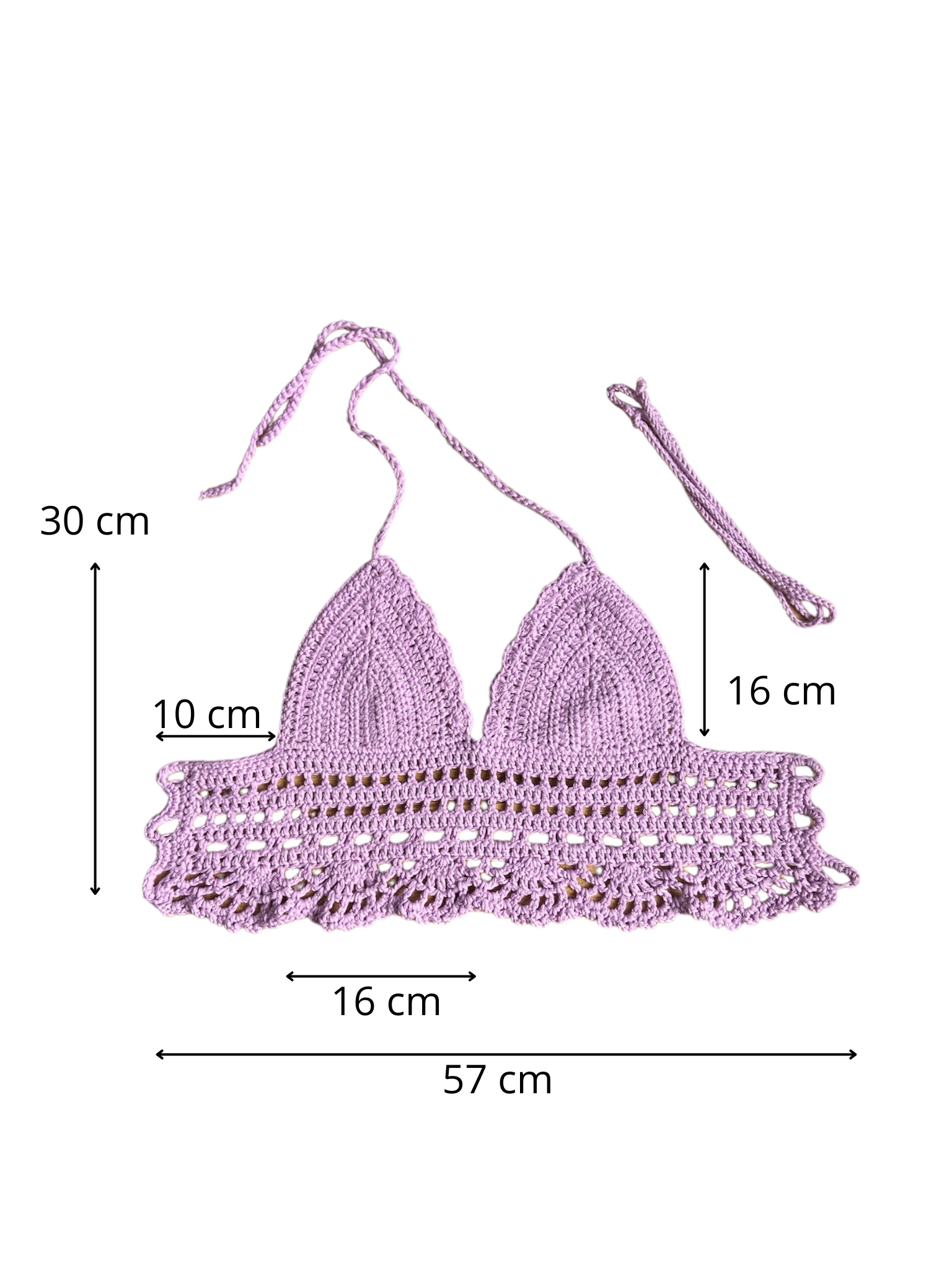 Unieke, handgemaakte gehaakte bralette met kanten afwerking, van 100% katoen, in licht paarse kleur. Deze klassieke crochet top heeft een mooie kanten afwerking en is perfect voor festivals, zomerse dagen en casual boho-outfits. Combineer hem met high-waisted shorts, rok of jeans voor een stijlvolle look.