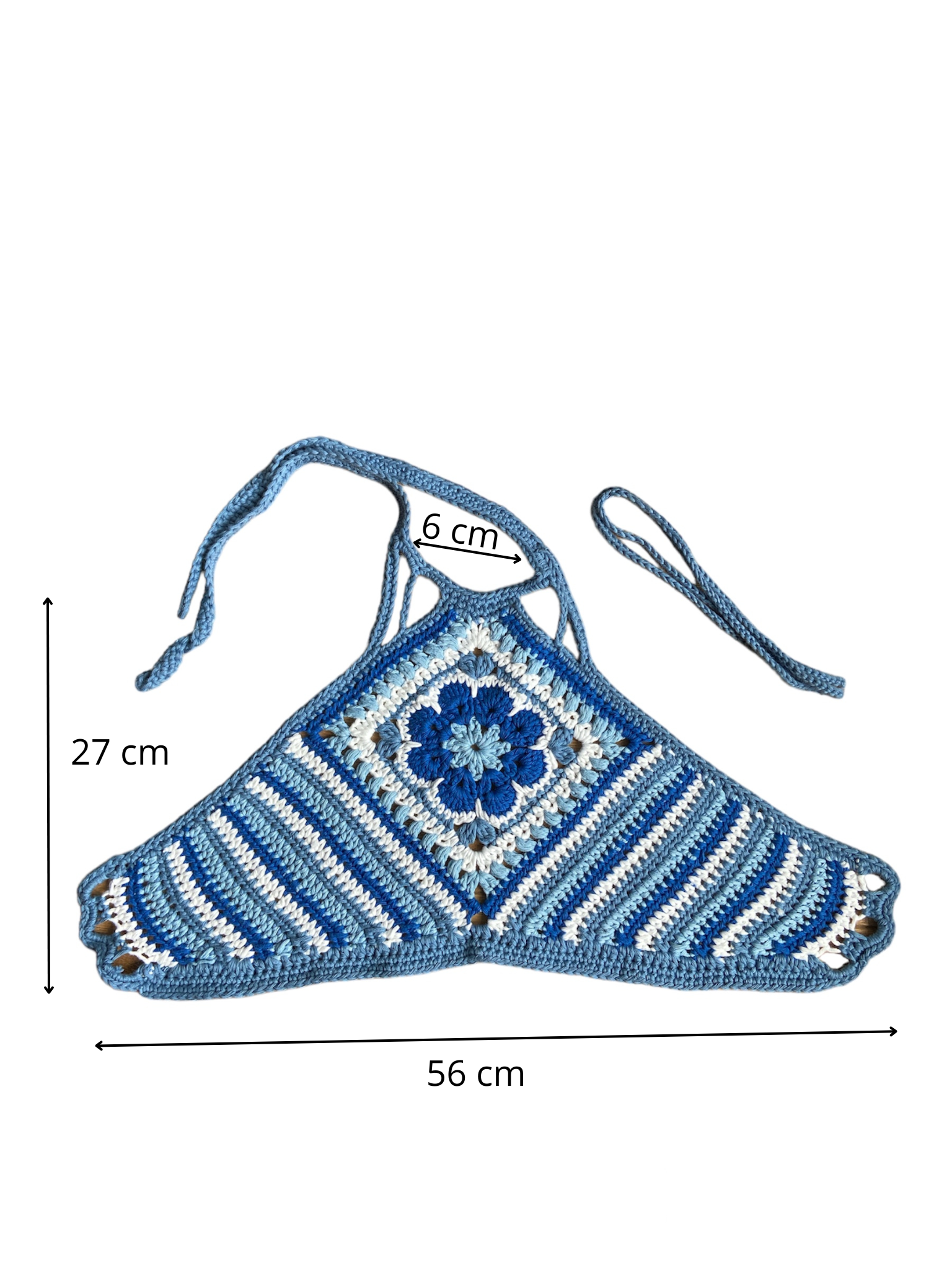 Unieke en handgemaakte crochet haltertop van 100% katoen, met een opvallend bloemenmotief in granny square stijl, in blauwe tinten. Elke top is met zorg gemaakt en daardoor echt one-of-a-kind – niemand heeft dezelfde! Deze boho crop top is kleurrijk en modern en is perfect voor festivals, zomerse dagen of als stijlvolle statement-piece. Combineer hem met high-waisted shorts, roken of jeans, voor een vrolijke, kleurrijke en modieuze look.